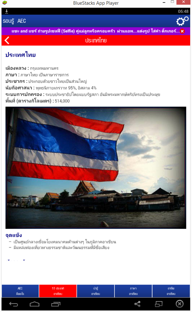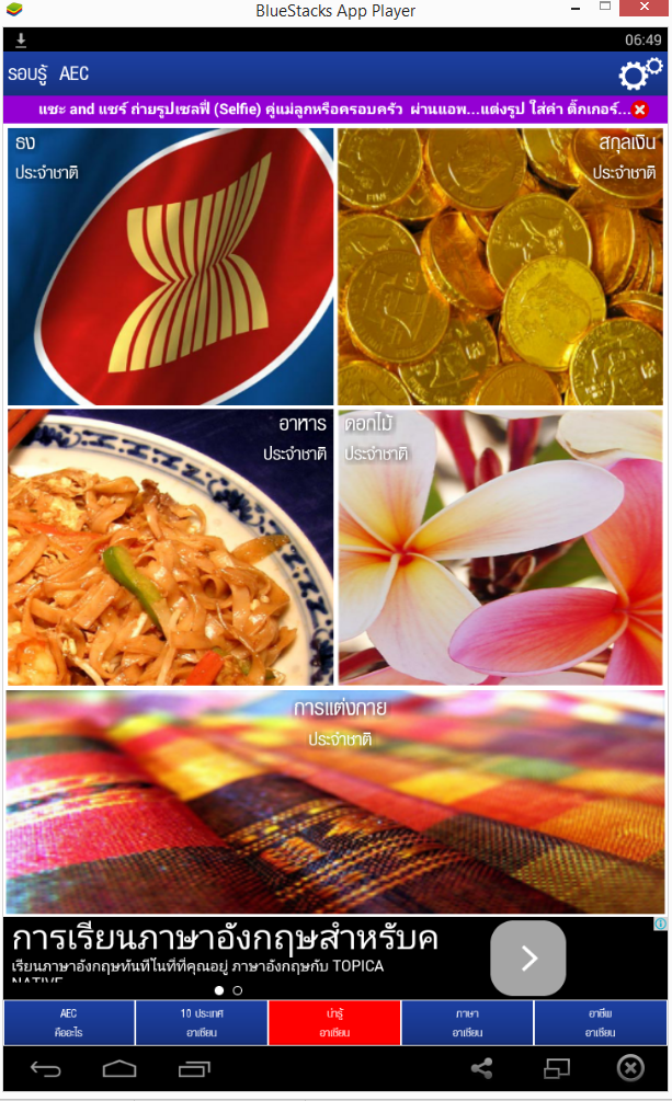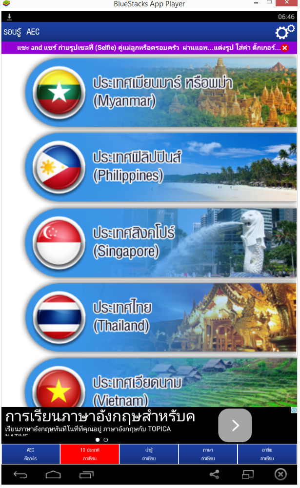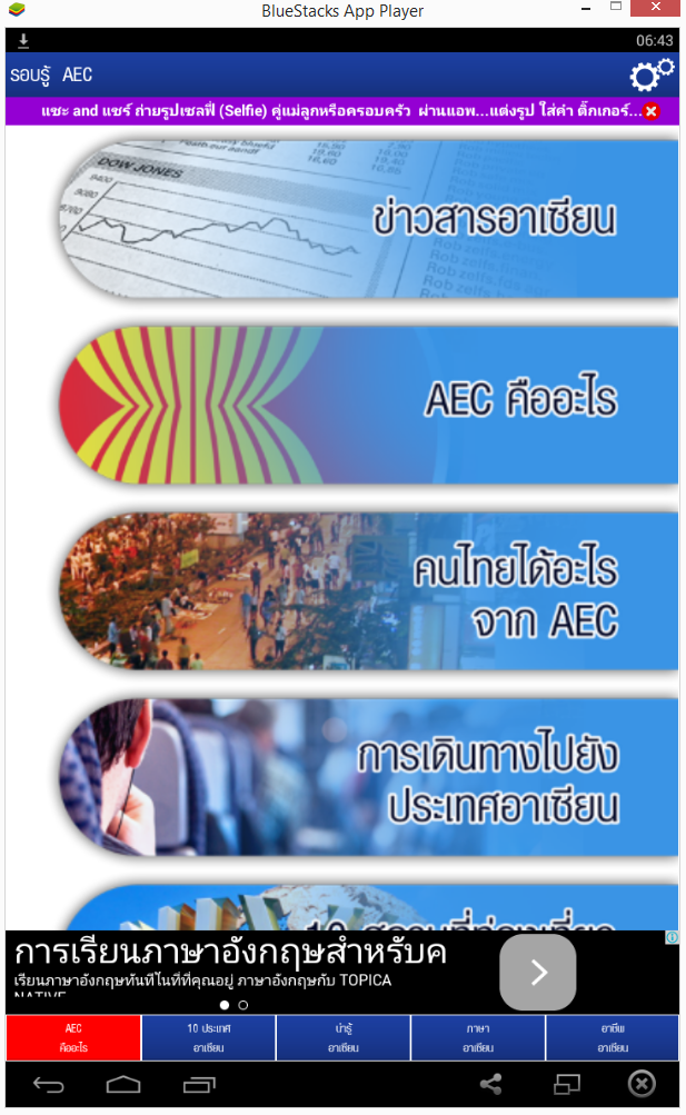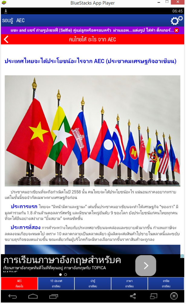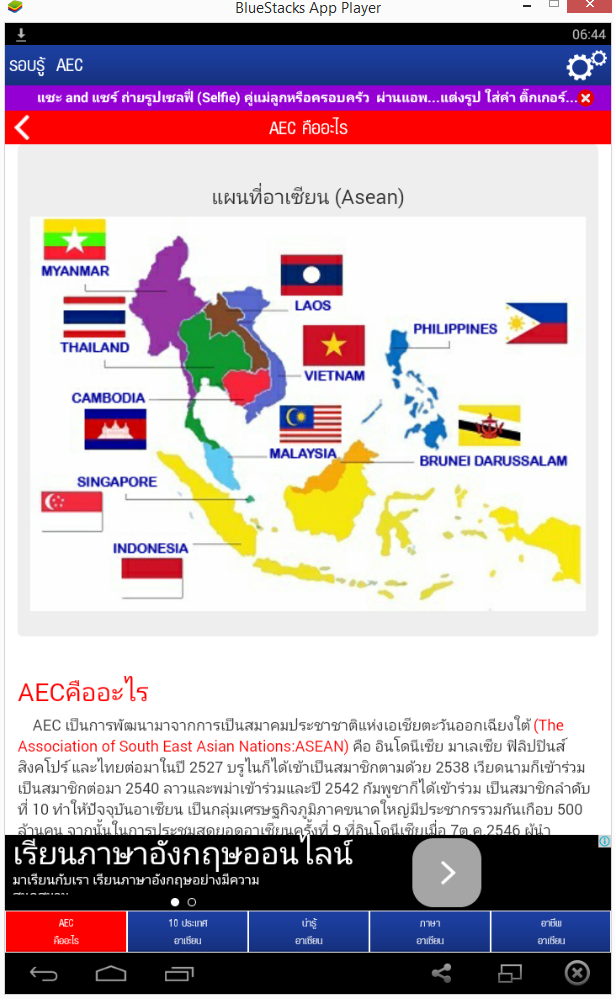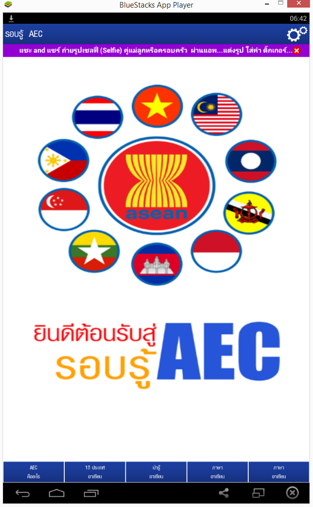 การนำเสนอ AEC บนอุปกรณ์ Touch Screen เราสามารถเปิดข้อมูล ASEAN ด้วยโปรแกรม Bluestack บน Windows โดย download APP ฟรี ชื่อ "รอบรู้ AEC" จาก App store ผมทดสอบเก็บภาพบนเครื่อง PC ธรรมดา แต่ถ้าเป็นจอ Touch Screen ก็จะนำเข้าติดตั้งใน "ห้อง ASEAN ศึกษา" แล้วให้บริการได้เลย มีตัวอย่าง ติดตั้งจอ Touch Screen บริการข้อมูลทั่วไปที่ BigC ลำปาง