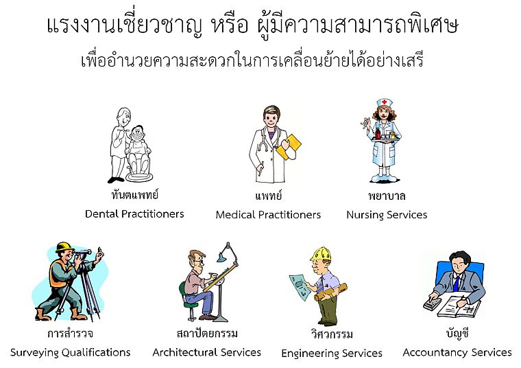 แรงงานเชี่ยวชาญ        การประชุมสุดยอดอาเซียนครั้งที่ 9 เมื่อ 7 ตุลาคม 2546 ที่บาหลี อินโดนีเซีย ได้กำหนดจัดทำข้อตกลงร่วมกัน (Mutual Recognition Arrangements : MRAs) เกี่ยวกับคุณสมบัติของวิชาชีพหลัก แรงงานเชี่ยวชาญ หรือผู้มีความสามารถพิเศษ เพื่ออำนวยความสะดวกในการเคลื่อนย้ายได้อย่างเสรี โดยจะเริ่มต้นในปี พ.ศ. 2558