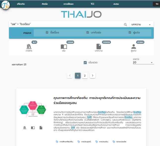 สืบค้น "sar" + "โรงเรียน" ใน thaijo thaijo สืบค้น เมื่อวันที่ 26 มิถุนายน 2568 พบบทความวิจัย 25 เรื่อง ซึ่งสามารถค้นได้จากฐานข้อมูล Thaijo ถ้าสนใจชื่อเรื่องใดแล้ว การค้นหาข้อมูลว่า 1) ผู้เขียนคือใคร 2) จากหน่วยงาน โรงเรียน หรือ มหาวิทยาลัยใด 3) ตีพิมพ์ในวารสารอะไร 4) ปีที่เท่าไร 5) อยู่กลุ่ม 1 หรือ 2 6) มีความเป็นมาอย่างไร 7) มีวัตถุประสงค์ชัดเจนหรือไม่ 8) มีประชากรและกลุ่มตัวอย่างคือใคร 9) มีวิธีการอย่างไร 10) ผลดำเนินการเป็นอย่างไร 11) สรุปผลแล้วได้อะไร 12) มีข้อเสนอแนะเชิงนโยบายหรือไม่ สรุปได้ว่า การหาคำตอบเกี่ยวกับบทความวิจัยใน thaijo ก็ไม่ใช่เรื่องยากอีกต่อไป