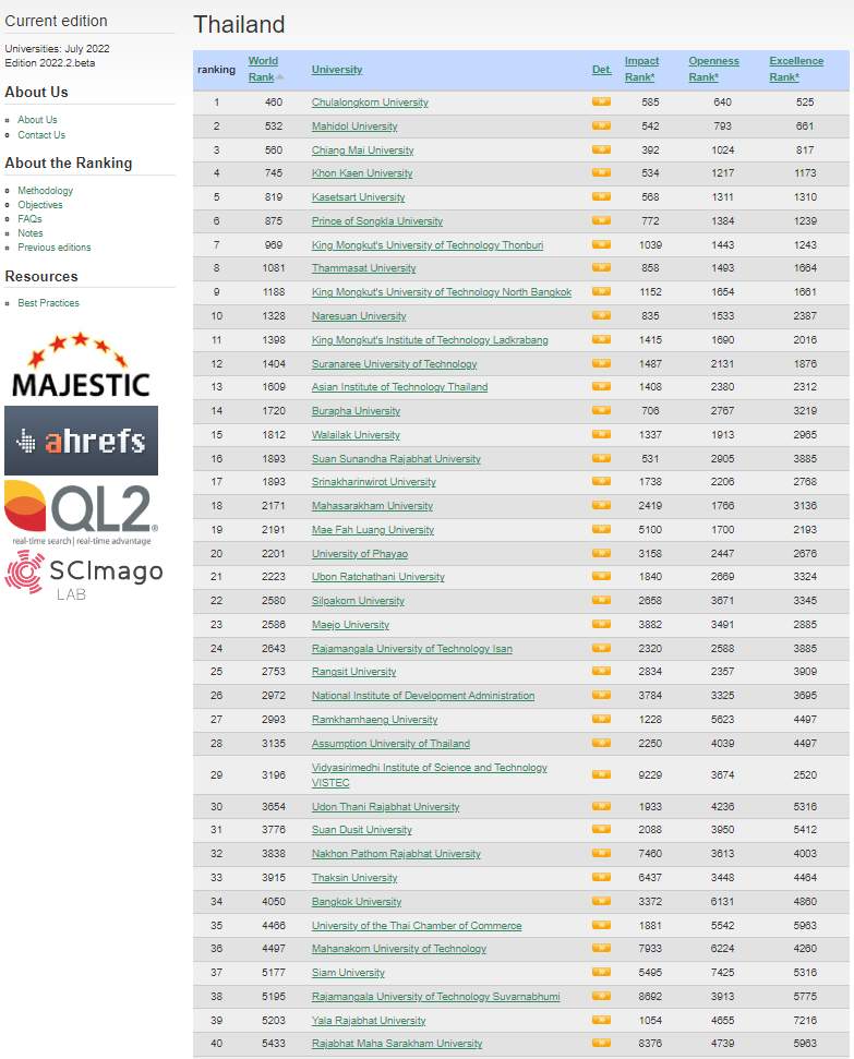 อันดับมหาวิทยาลัยไทย กรกฎาคม ค.ศ.2022 (พ.ศ.2565)