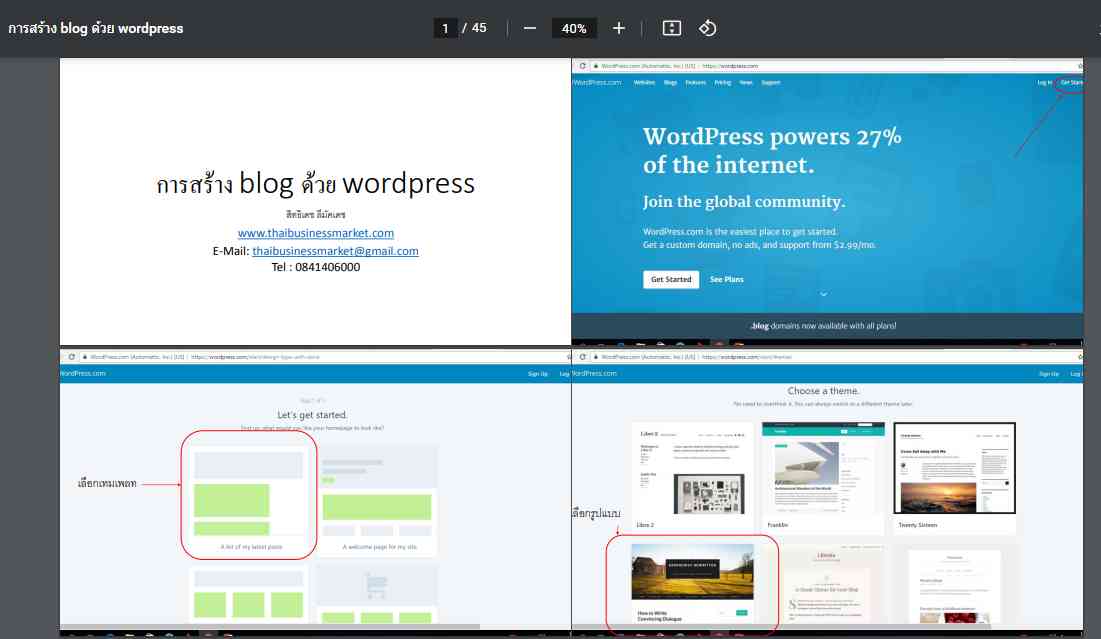 " การสร้างบล็อก การสร้างเพจและเมนู การติดตั้งชุดตกแต่ง คุณสมบัติเสริม (plugin) การใช้วิดเจ็ต (widget) ปรับ SEO โดย สำนักวิทยบริการและเทคโนโลยีสารสนเทศ มหาวิทยาลัยเทคโนโลยีราชมงคลรัตนโกสินทร์ - 41 หน้า ในแบบ powerpoint