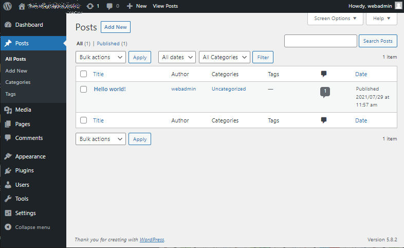 คือ หน้าต่างควบคุมโพสต์และกลุ่มในระบบ blog ทั้งหมด พบตัวเลือก All Posts, Add New, Categories, Tags