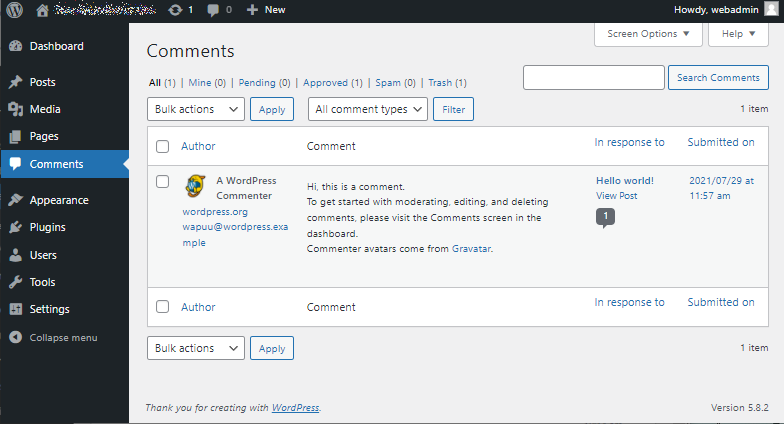 คือ หน้าต่างควบคุมการตั้งค่าของระบบ ซึ่งมีรายละเอียดจำนวนมาก พบตัวเลือก General, Writing, Reading, Discussion, Media, Permalinks, Privacy, Pange Numbers, Sharing