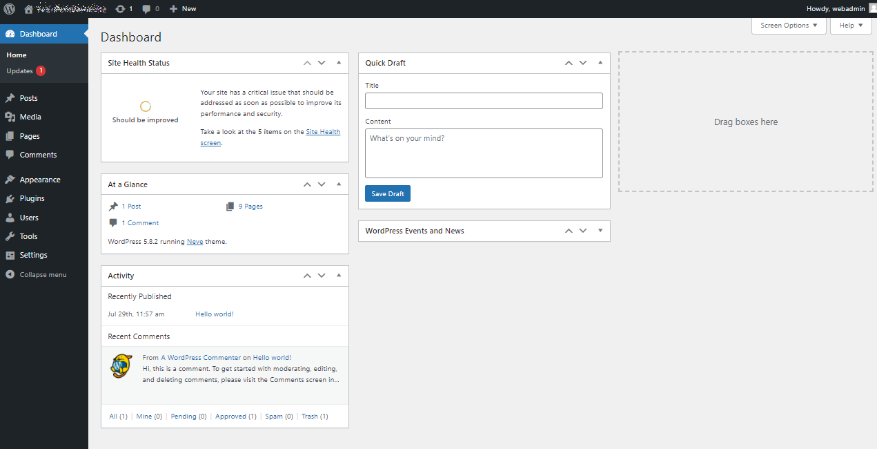 คือ หน้าต่างควบคุมการทำงานที่แสดงข้อมูลหรือบริการที่ใช้บ่อย เช่น สถานะสุขภาพไซต์ (site health status), รายการกิจกรรม (activity), ร่างโพสต์ด่วน (quick draft), ข่าวและเหตุการของเวิร์ดเพรส (wordpress event and news), สถานะจากเจ็ตแพ็ค (stats by jetpack) หรือ ที่รวดเร็ว (at a glance) เช่น จำนวนโพสต์ เพจ หรือคอมเมนต์