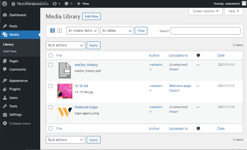 คือ หน้าต่างควบคุมสื่อ ที่จะเชื่อมโยงทั้งใน post และ page รองรับสื่อทุกประเภท พบตัวเลือก Library และ Add New