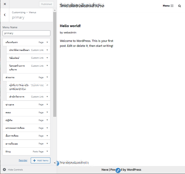 คือ หน้าต่างควบคุมการจัดการตัวเลือก ซึ่งส่วนนี้จะเปิดให้เพิ่มตัวเลือกได้หลายแบบ เช่น Posts, Page หรือ Custom Links แล้วยังมีความสัมพันธ์กับเมนูอีก 2 แบบ คือ Primary Menu และ Social Links Menu