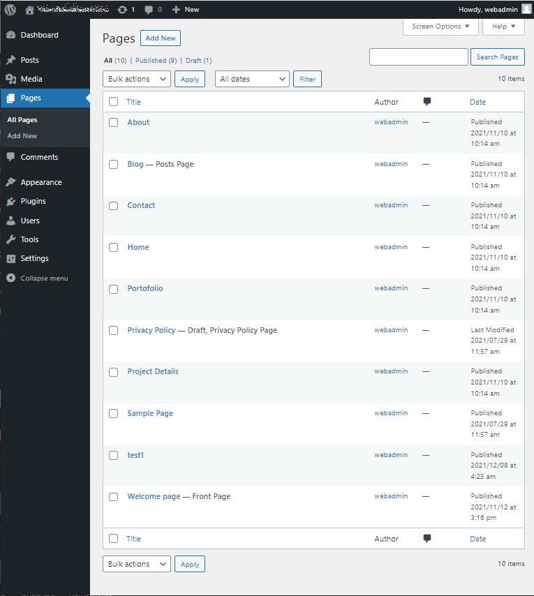 คือ หน้าต่างควบคุมเว็บเพจ (page) ที่แสดงข้อมูลรายการเว็บเพจที่ถูกสร้างขึ้นแล้ว ที่ถือเป็นบริการหลักสำหรับการใช้ Wordpress แสดงเนื้อหาแบบ Homepage ที่มีรูปแบบ และเนื้อหาที่กำหนดเอง พบตัวเลือก All Pages และ Add New