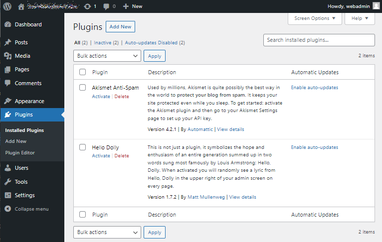 คือ หน้าต่างควบคุมโปรแกรมที่นำเข้าจากภายนอก หรือที่พัฒนาขึ้นเอง เป็นชุดคำสั่งที่ถูกติดตั้งเพิ่ม เพื่อให้ทำงานร่วมกับเวิร์ดเพรส พบตัวเลือก Installed Plugins, Add New, Plugin Editor มีตัวอย่าง plugins ที่น่าสนใจ เช่น Akismet Anti-Spam, Jetpack, WP Page Numbers, หรือ Hello Dolly (preload) ซึ่งเป็นชื่อเพลงที่ผู้พัฒนาเวิร์ดเพรสชื่นชอบ แล้วจะสุ่มเนื้อเพลงเพียงสองคำไปแสดงในหน้า wp-admin ที่มุมบนขวา