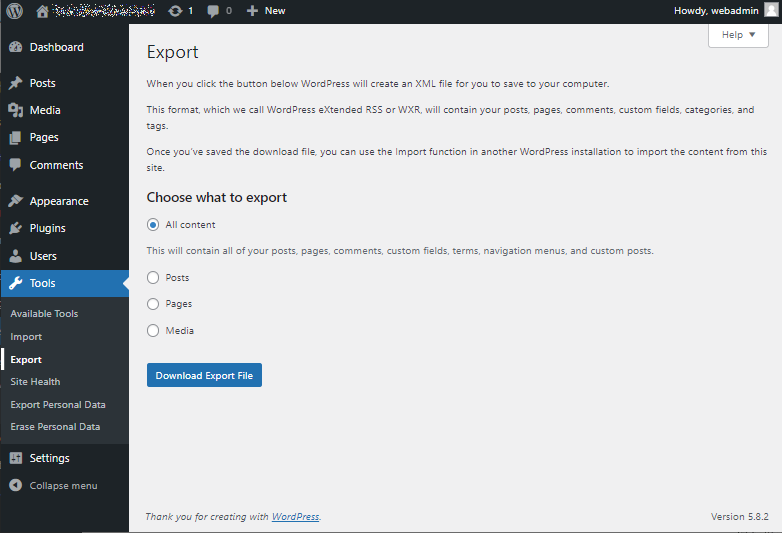 คือ หน้าต่างควบคุมเครื่องมือที่ใช้งาน ซึ่งเลือกติดตั้งเครื่องมือเพิ่มได้ พบตัวเลือก Available Tools, Import, Export, Site Health การ Import นี้สามารถนำ Post หรือ Comments จากระบบอื่นเข้ามาได้ เช่น Blogger, LiveJournal, Tumblr, Wordpress เป็นต้น