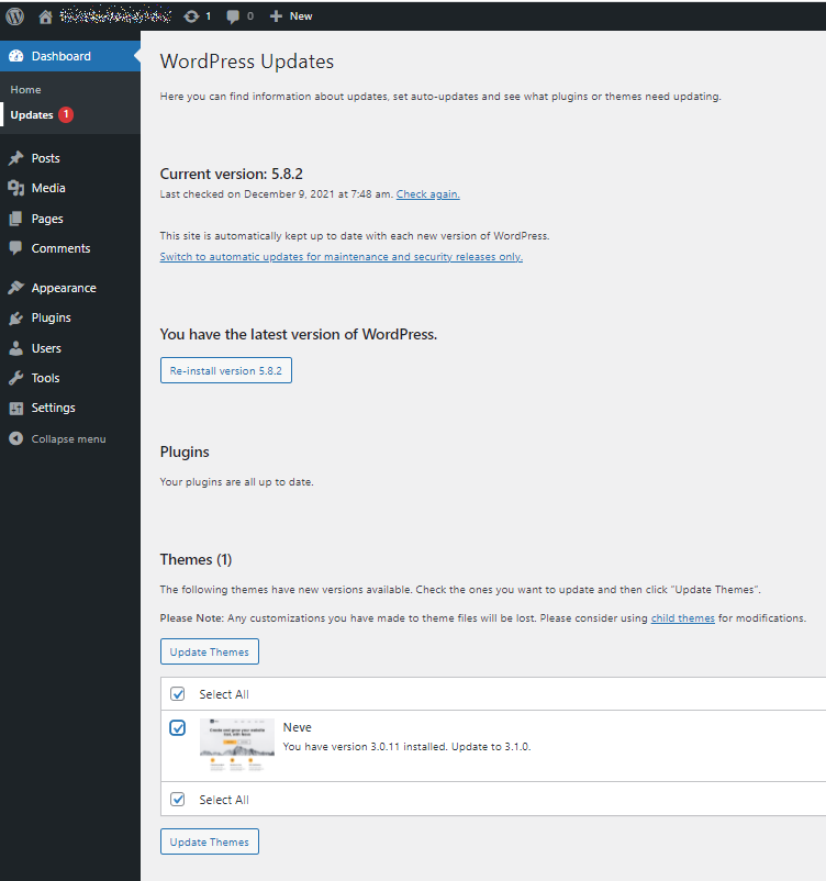 คือ หน้าต่างแสดงข้อมูลรุ่นที่ถูกพบว่าเป็นรุ่นเก่า และแนะนำให้มีการปรับปรุงเป็นรุ่นใหม่ ซึ่งจะติดตามรุ่นของ theme, plugins และ wordpress จากแหล่งผู้ให้บริการโดยอัตโนมัติ