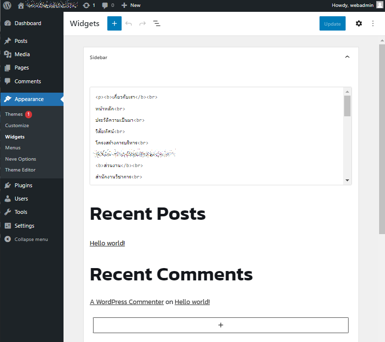 คือ หน้าต่างควบคุมโปรแกรมหรือชุดคำสั่งขนาดเล็กที่ถูกพัฒนาสำหรับทำงานร่วมกับเวิร์ดเพรส สามารถติดตั้งเพิ่ม แล้วนำเข้าใช้งานใน sidebar หรือ bottom ได้